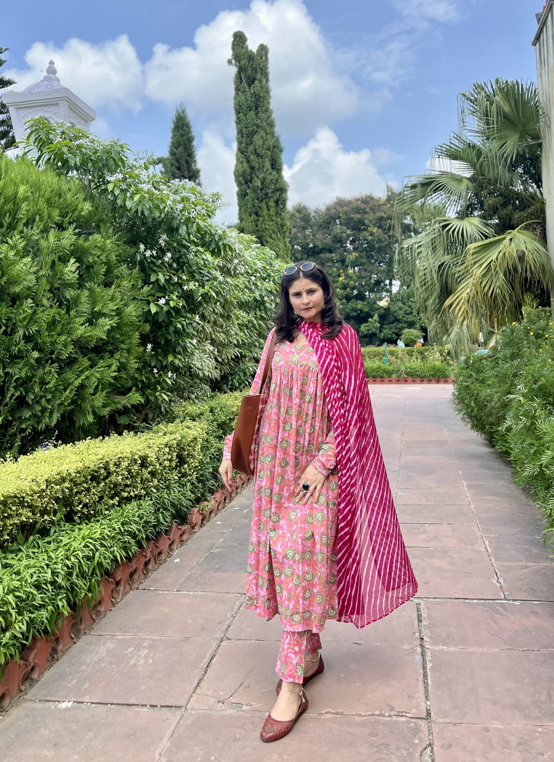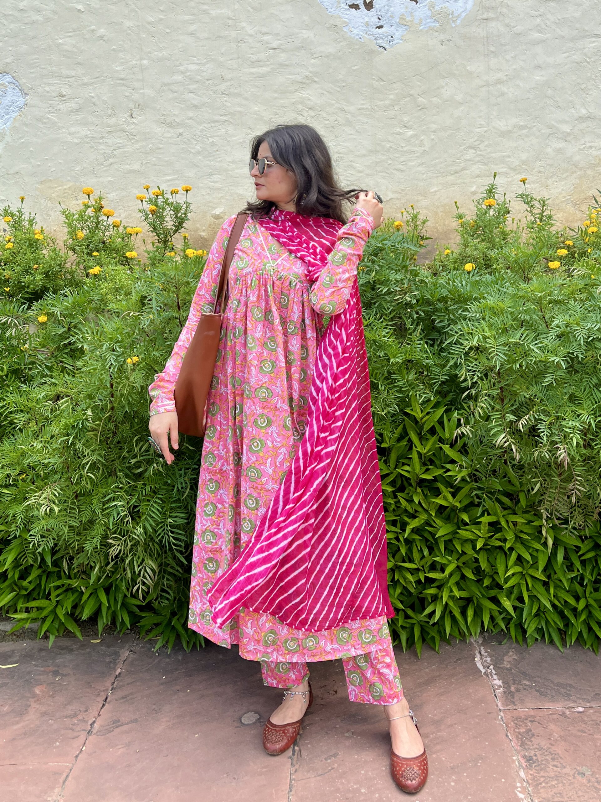 Handblock printed pure cotton floral alia suit with gota details neck and sleevs it comes with chiffon lehariya dupta